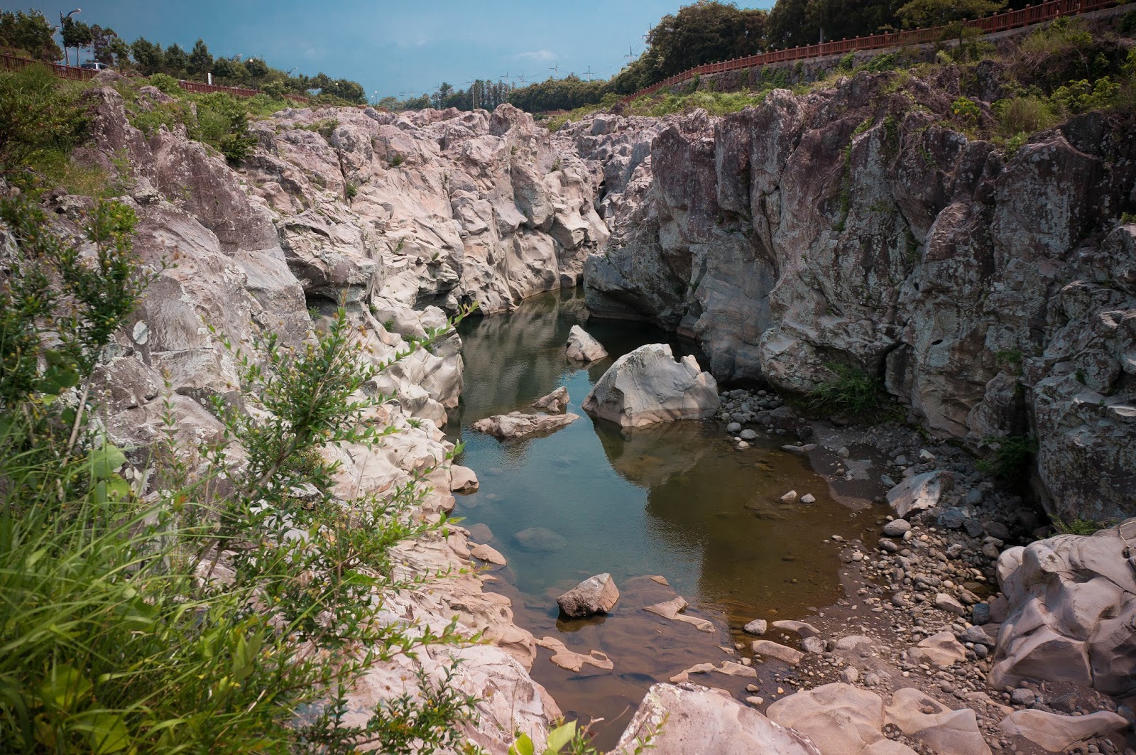 I got off the bus where the guy told me to (with the help of a local reading the scrap of paper with my stop written on it in Korean), and started walking towards the beginning of the trail. It ended up being nearly a mile away from the bus stop. I put on my sunscreen (which I'd forgotten to put on at the hostel) and started following my google map on my phone. Eventually I hit larger looking street and saw some huge rocks in a ravine on the other side of the road. I decided to check it out. Because, well, this whole trek was about checking things out, enjoying the journey, and so on.